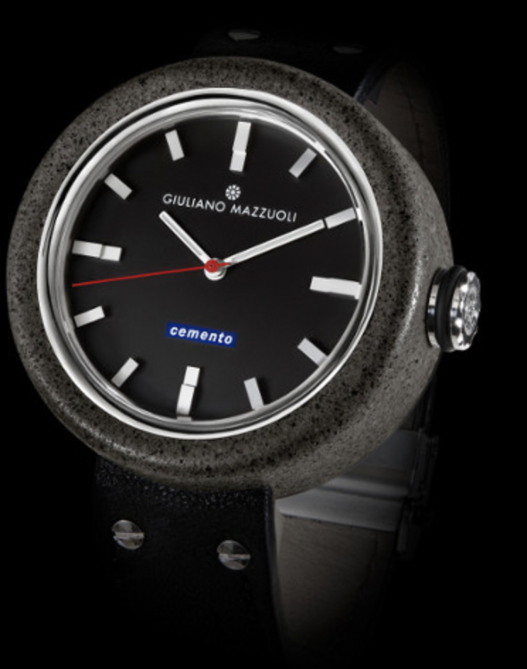 独特な色彩効果を持つ素材を探していたときに庭にいたセメント職人が、新たな素材への挑戦のきっかけとなり、作られた時計。イタリア産セメントが心地よい触感を与える。
