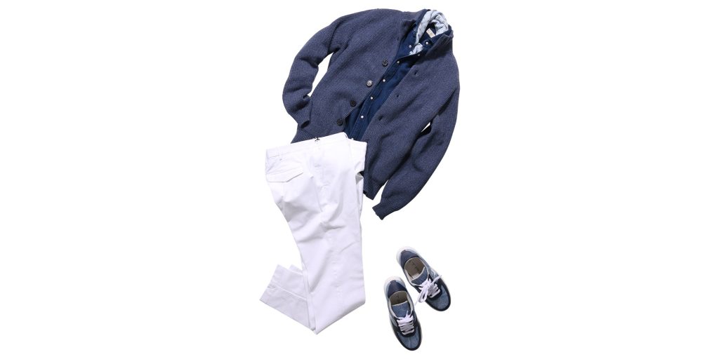 ニットブルゾン LAMANO ARTISANS ¥102,300 ネッカチーフ POGGIANTI 1958 ¥17,930 シャツ XACUS ¥28,050 パンツ PT TORINO ¥42,900 スニーカー ETRO ¥51,700 ブルーを基調としたスマートなカジュアルスタイル。 <PT TORINO>のホワイトパンツがよりスマー... -